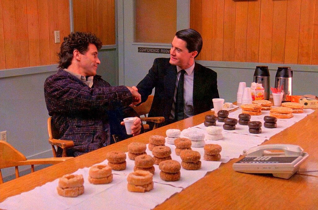 „Туин Пийкс“ не е само в черно и червено. Време е за почивка и десерт! Невъзможно е да говорим за мистериозния свят на Дейвид Линч и да не си представим закуската на агент Купър и шериф Хари Труман, а също и аромата на силно кафе. Човек не може да решава важни проблми на празен стомах, нали?! Колко ли пая приготвят в „RR“ на ден, за да стигнат за всички любители?!